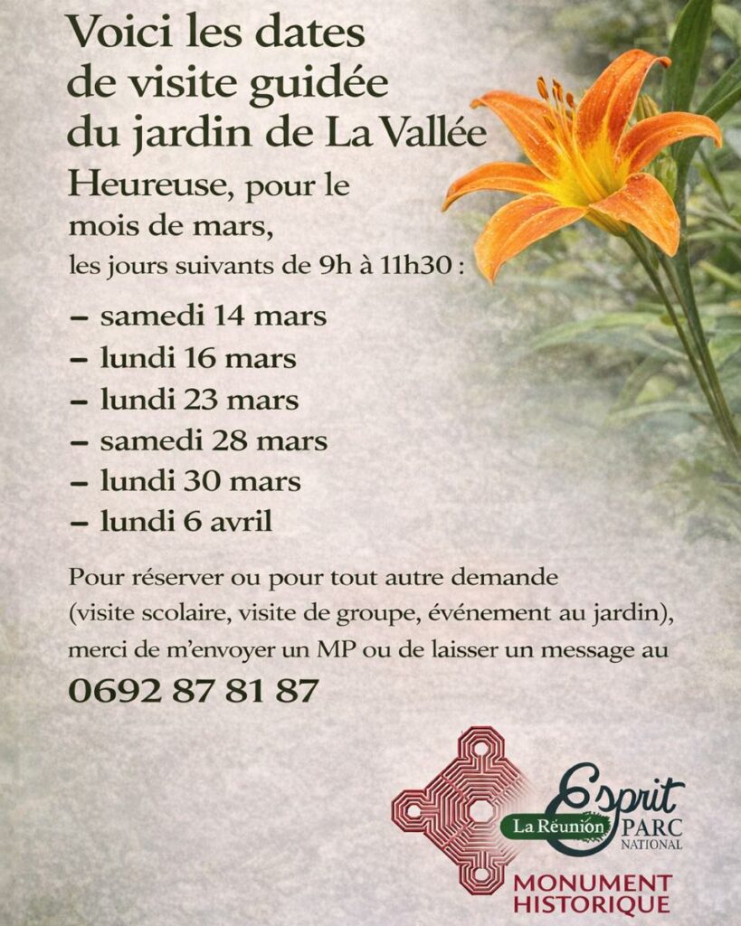Le Jardin de la Vallée, vieux jardin créole dans les hauts de Saint-Denis au Brûlé, vous accueille de 9h à 11h30 samedi 28 mars pour une visite guidée.