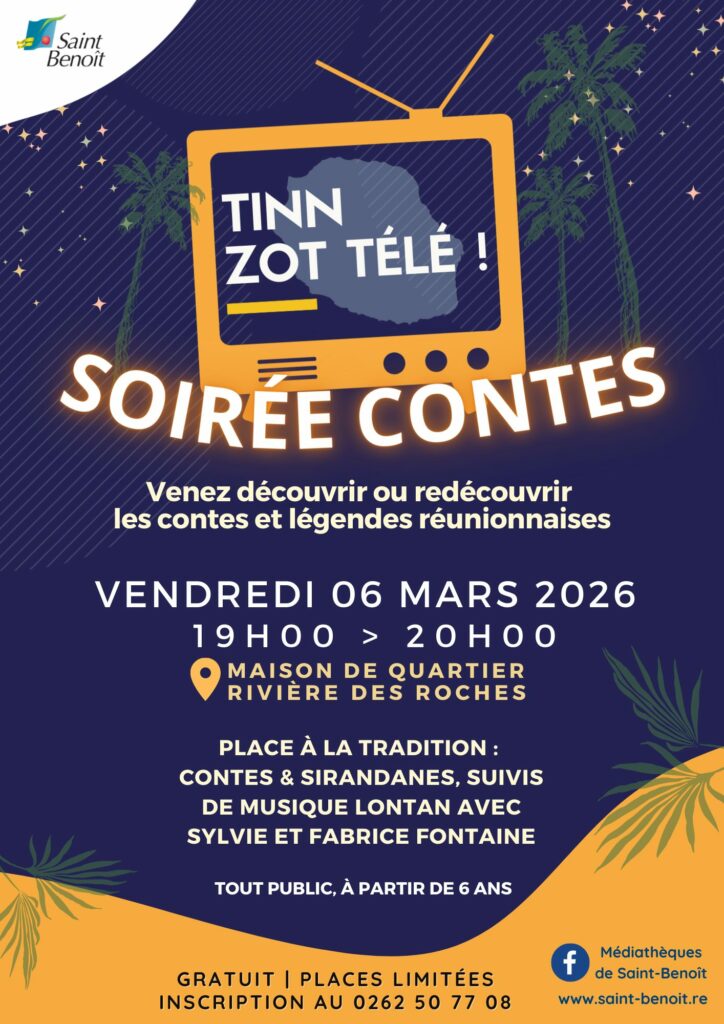 Venez découvrir ou redécouvrir les contes et légendes réunionnaises lors d’un moment chaleureux et convivial, animé par les médiatrices culturelles vendredi 06 mars de 19h à 20h. Au programme : contes & sirandanes, suivis de musique lontan avec Sylvie et Fabrice Fontaine.