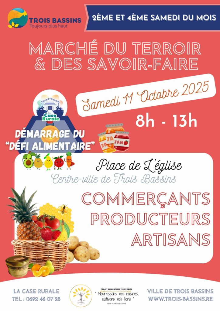 Le marché du Terroir et des Savoir-Faire se tiendra samedi 11 octobre de 8h à 13h place de l’Eglise à Trois-Bassins. Celui-ci marquera également l’ouverture du Défi Alimentaire : un parcours d’animations ludiques, interactives et inspirantes autour de l’alimentation, de la santé et du bien-vivre local ! L’objectif ? Découvrir, apprendre, s’amuser… et tenter de remporter des lots du terroir en participant aux différents ateliers proposés.