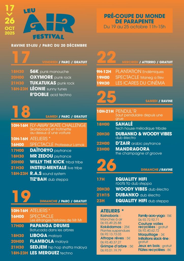 C’est le retour du Leu Air Festival du 17 au 26 octobre au Parc 20 décembre et à la Ravine de Saint-Leu, en partenariat avec l’Office de Tourisme de l’Ouest. Rendez-vous à la Ravine Saint-Leu le samedi 25 octobre 2025 pour une soirée électrisante au cœur du festival avec :