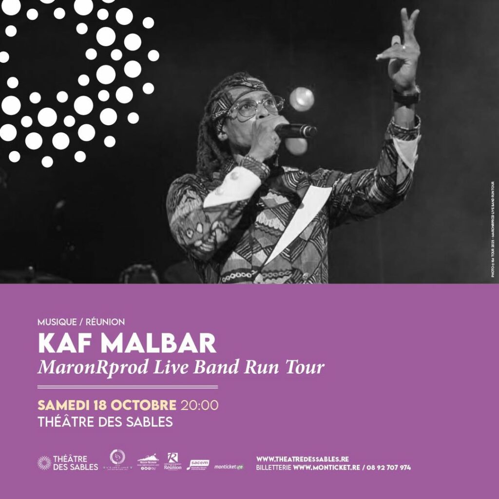 La ville de L’Étang-Salé, le théâtre des Sables ainsi que ses partenaires organisent le « MaronRprod Live Bande Run Tour » avec KAF MALBAR samedi 28 octobre à 20h au Théâtre Les Sables. Plus d’infos : www.theatredessables.re