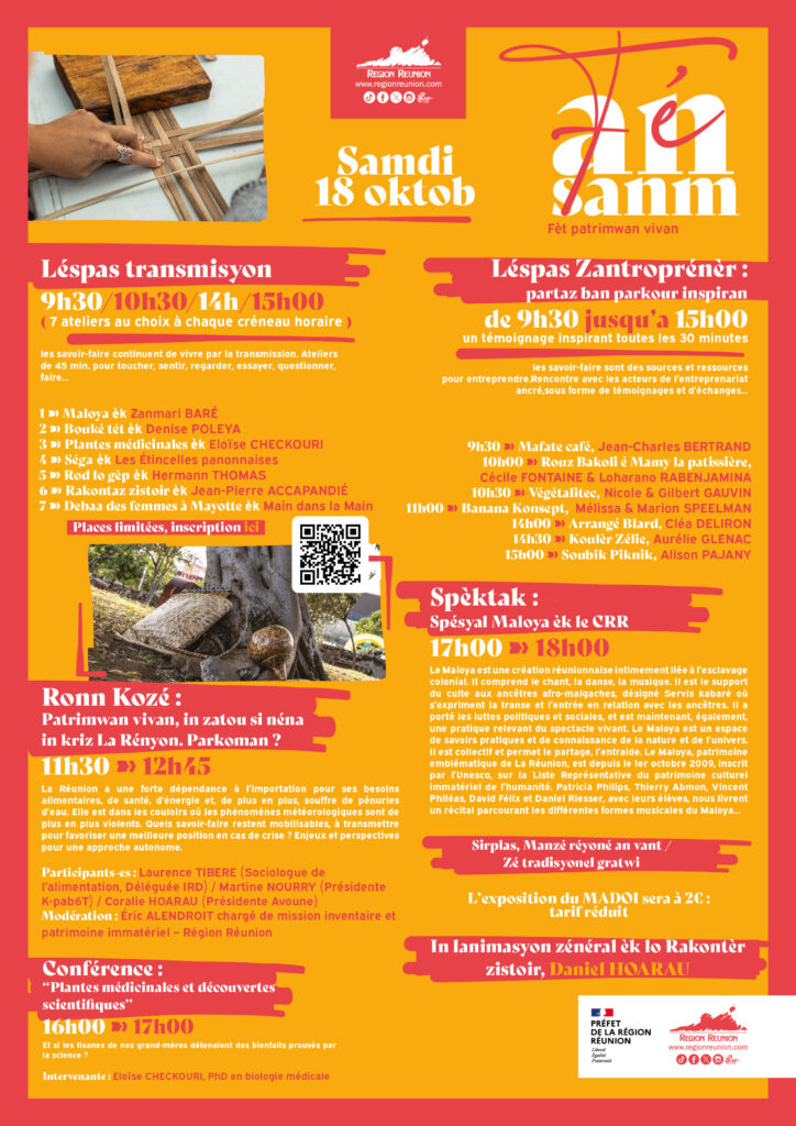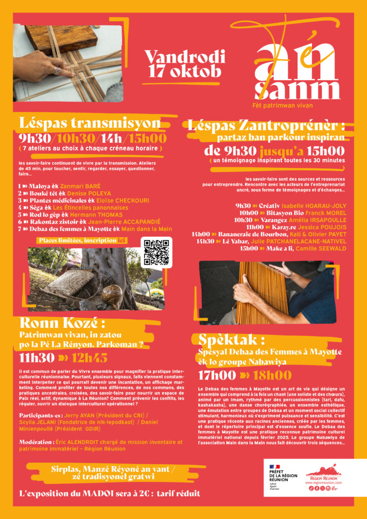 Venez vibrer au rythme du patrimoine réunionnais ! Les 17 et 18 octobre, la Région vous invite à deux journées de partaz, kiltir et fierté péi au MADOI. Au programme :