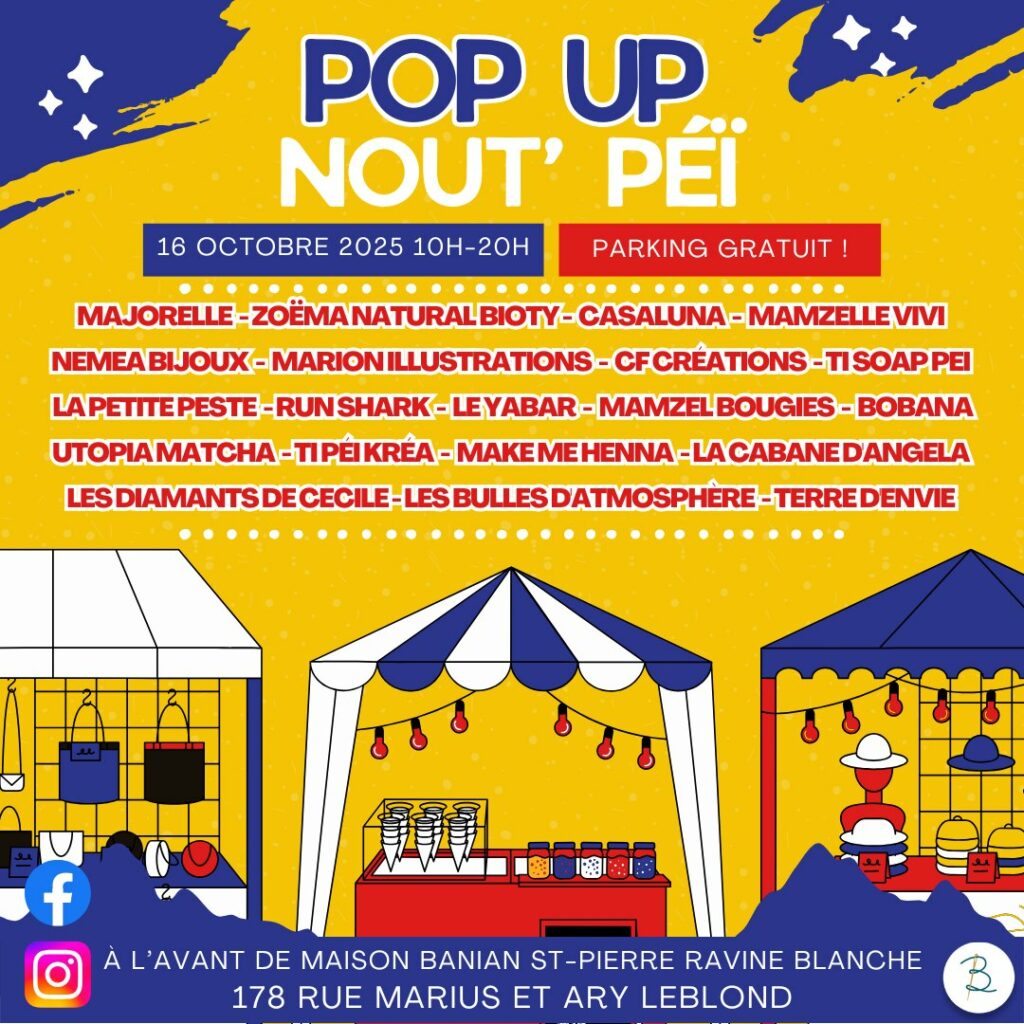 Jeudi 16 octobre, de 10h à 19h, devant le magasin Maison Banian à Saint-Pierre, venez découvrir des artisans et créateurs locaux, acheter des souvenirs et surtout vous faire plaisir avec 20 exposants sur place.