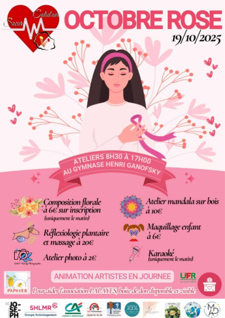 Le dimanche 19 octobre 2025, l’association soeur solid’air organise une journée d’animations au Gymnase Henri Ganofsky à Saint-Joseph, de 8h30 à 17h00, pour sensibiliser, divertir et rassembler le public autour d’une cause qui nous concerne tous. Tout au long de la journée, les visiteurs pourront profiter d’un large éventail d’ateliers : composition florale (6 €, matin uniquement), réflexologie plantaire et massage (20 €, toute la journée), atelier photo (2 €), maquillage pour enfants (6 €), ou encore initiation au mandala sur bois (10 €) et un karaoké gratuit (matin uniquement).