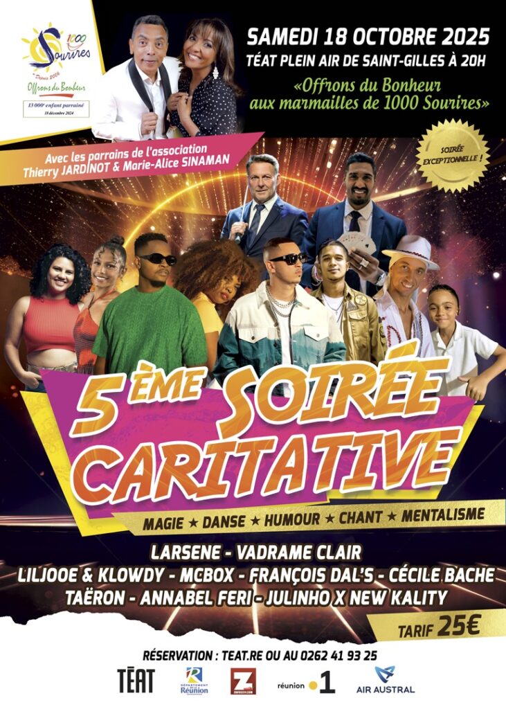 Vous voulez soutenir 1000 Sourires ? Mettre, au moins, 1000 Sourires sur les visages des enfants, c’est l’engagement de l’association depuis 19 ans. Pour notre 5ᵉ soirée caritative, on vous a concocté un spectacle incroyable au Téat Plein Air de Saint-Gilles, le samedi 18 octobre à 20h00 :