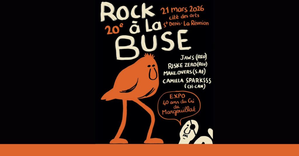 Le Rock à La Buse revient s’ancrer à la Cité des Arts pour sa 20ème édition samedi 21 mars à 20h. Au programme : quatre groupes de rock venus de La Réunion – Riske Zero (rock noise) et Jaws (psychobilly punk) – ainsi que d’autres horizons, avec Camilla Sparksss (Suisse/Canada, électro noise) et Make-Overs (Afrique du Sud, garage noise). Cette édition proposera aussi des concerts dessinés, en collaboration avec des auteurs de BD locaux et invités, à l’occasion des 40 ans du Cri du Margouillat.