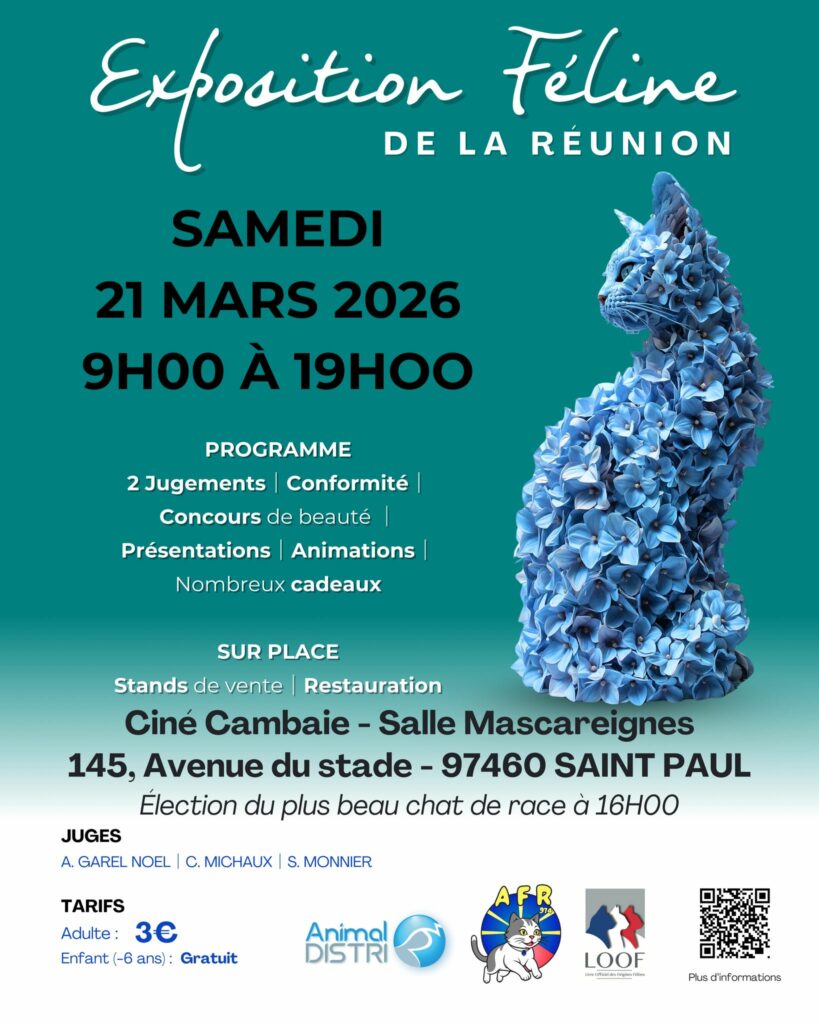 Plus d’une douzaine de races présentes à l’exposition féline de la Réunion, qui se tiendra samedi 21 février de 9h à 19h. Il y en a pour tous les goûts : poils longs, poils courts, grands et moins grands, oreilles droites ou courbées, rares et moins rares, voire même hypoallergéniques. Et des couleurs tellement variées ! Profitez d’un moment de partage privilégié avec les éleveurs et adoptants sur notre passion commune. Et si tel est votre souhait, la SPA, présente à nos côtés, vous propose des chats à l’adoption.