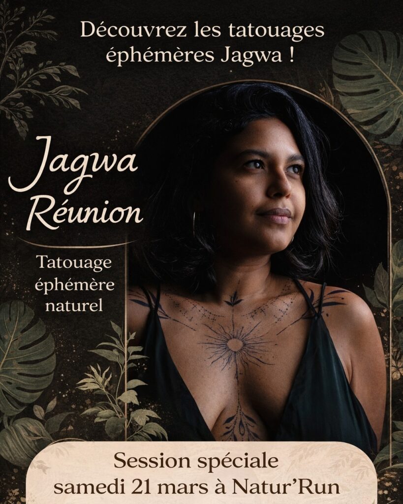 Le samedi 21 mars de 9h30 à 18h en continu à la boutique Natur’Run avec ou sans rendez-vous, Jagwa Réunion sera présent chez Natur’Run pour une journée dédiée aux tatouages éphémères naturels.