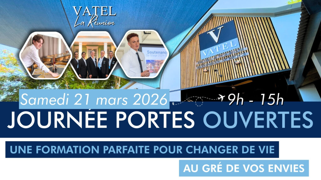 Venez découvrir la Business School Vatel Réunion lors de notre Journée Portes Ouvertes le samedi 21 mars 2026 de 9h à 15h. Une occasion unique de plonger dans l’univers du management hôtelier et d’explorer notre magnifique campus situé à Saint-Gilles-Les-Bains. Au programme :