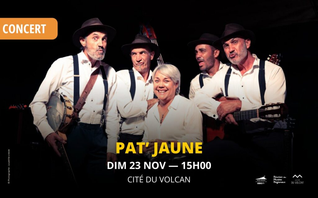 Le célèbre groupe de la Plaine des Cafres présente les titres de son dernier album A moin YAB toul’temps et nous offre un voyage en plein cœur de l’univers yab. Au programme également : un pêle-mêle des plus grands succès de Pat’Jaune (Ti Catoune, Polka Angelo, Viens voir la Réunion, etc…).