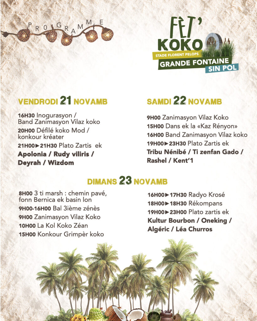L’incontournable Fête Koko i arvien. Nou donne à zot rendez-vous du 21 au 23 novembre 2025 pour un week-end festif. Rendez-vous au stade Florent Pelops à la Grande Fontaine avec la participation de nombreuses associations de Saint-Paul pour ce grand moment !