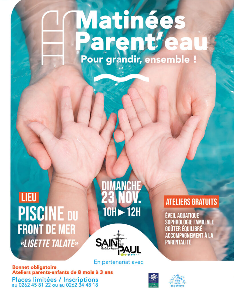 La Ville de Saint-Paul vous donne rendez-vous le dimanche 23 novembre 2025, de 10h à 12h, à la piscine du Front de mer Lisette Talate pour une moment dédiée à la détente, au jeu et au lien parent-enfant. Au programme de ces ateliers gratuits : éveil aquatique, sophrologie familiale, goûter équilibré…