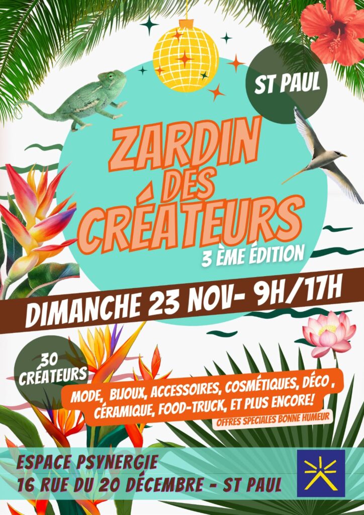Le 23 novembre à Saint-Paul, rendez-vous au zardin des créateurs à Saint-Paul. Venez découvrir les créations de 30 artisans : mode, bijoux, cosmétiques, illustrations, céramiques, accessoires, déco, ameublement, curiosités, plantes, gourmandises… et même un Food Truck !