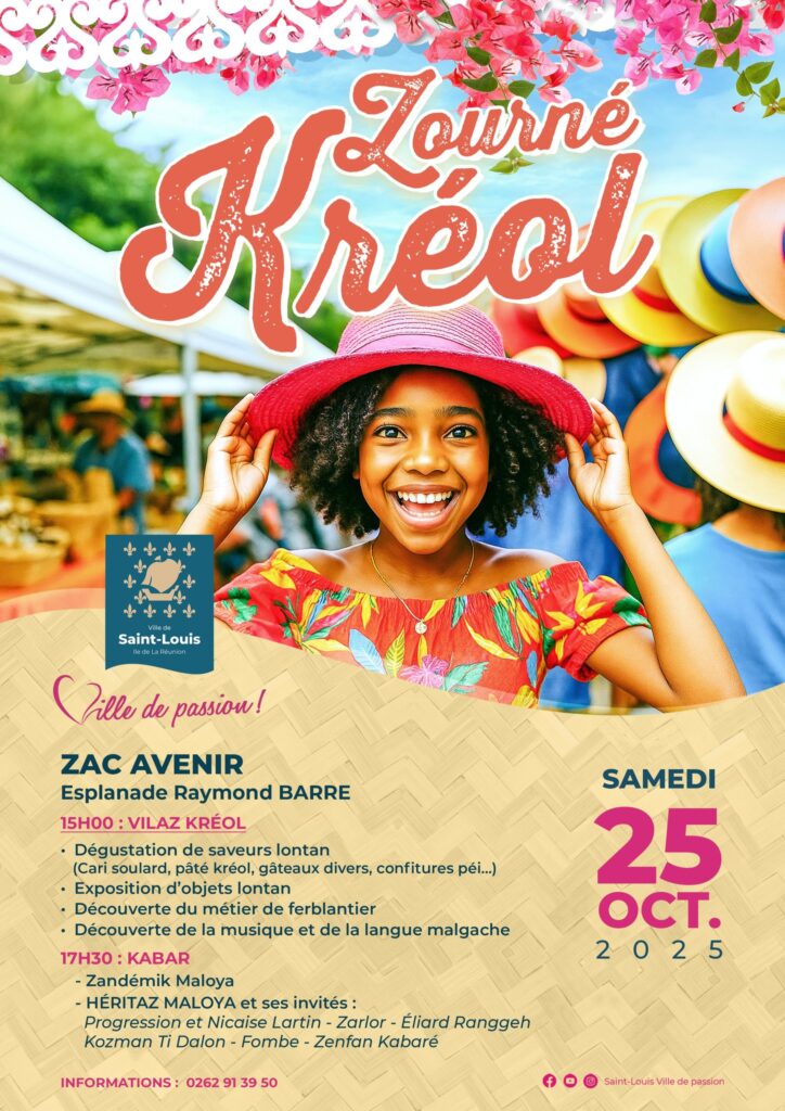 Le samedi 25 octobre, Saint-Louis y èt son kréolité en lèr plage Raymond Barre à la Zac Avenir et Place du marché forain à partir de 15h avec un village kréol. Vous y découvrirez une exposition d’objets lontan, possibilité de déguister savèr lontan : cari soulard, pâté kréol, confitures et gateaux péi et découverte du métier de ferblantier. La journée se clôturera sur un concert.