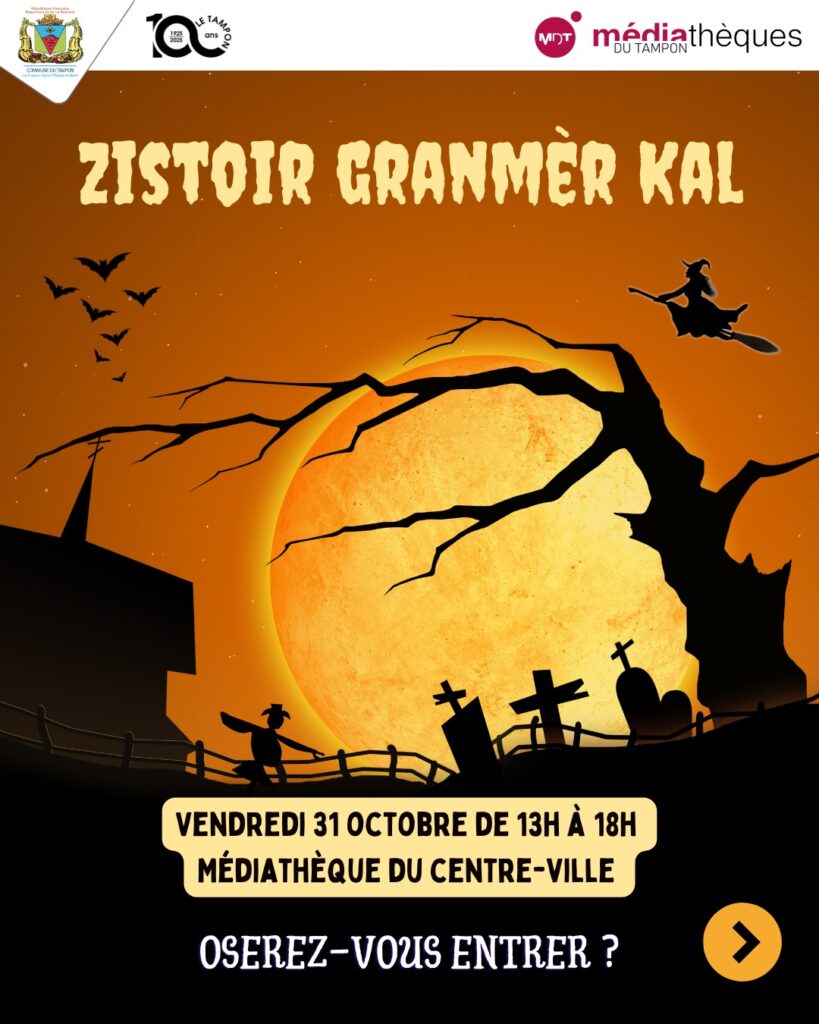 Le vendredi 31 octobre, de 13h à 18h, la médiathèque du centre-ville vous invite à célébrer Halloween à la mode péi avec l’événement Zistoir Granmèr Kal ! Au programme, des animations pour petits et grands : jeux de société, chasse au trésor, zistoir lontan, ciné’fil spécial Halloween…