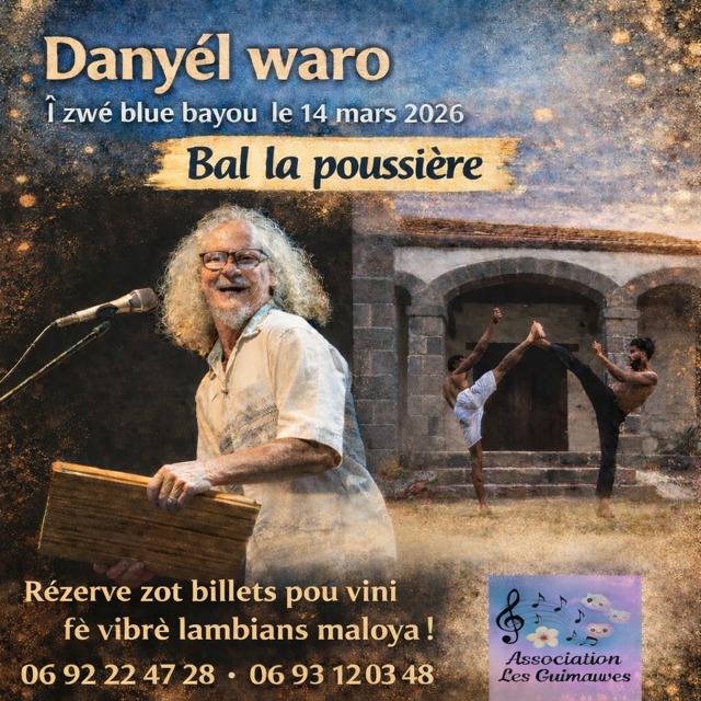 L’Association Les Guimauves et la ville de L’Étang-Salé vous invitent au Bal la Poussière, une journée placée sous le signe de la solidarité et de la fête ! Rendez-vous le samedi 14 mars 2026 de 17h jusqu’à 1h au Blue Bayou. Retrouvez sur scène un plateau artistique exceptionnel avec Danyel Waro, Lenka, Shelby, Kalbass, René Paul Elleleara, Jean-Roland Miquel et Adja Santana.