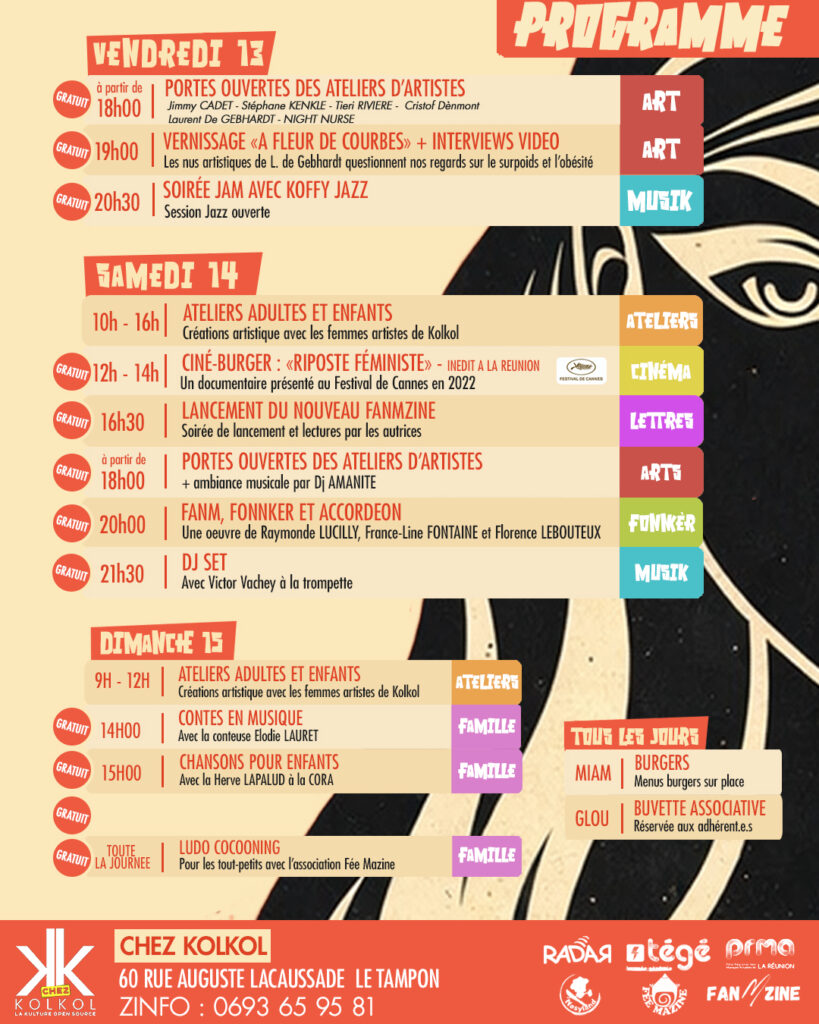 Expositions, littérature, théâtre & fonnkèr, musique, ateliers créatifs, une journée spéciale marmay et des visites d’ateliers d’artistes… Il y en aura pour tous les âges et toutes les sensibilités.