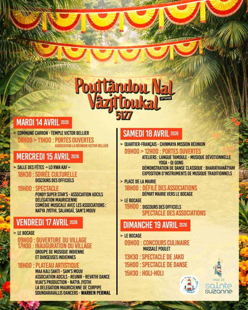 La Ville de Sainte-Suzanne et l’Association Culturelle Chapelle Front de Mer vous invitent à célébrer le Nouvel An Tamoul ! Le 15 ,17, 18 et 19 avril 2026, plongez au cœur des traditions et de la culture indienne à travers un programme riche et festif avec comme temps fort :
